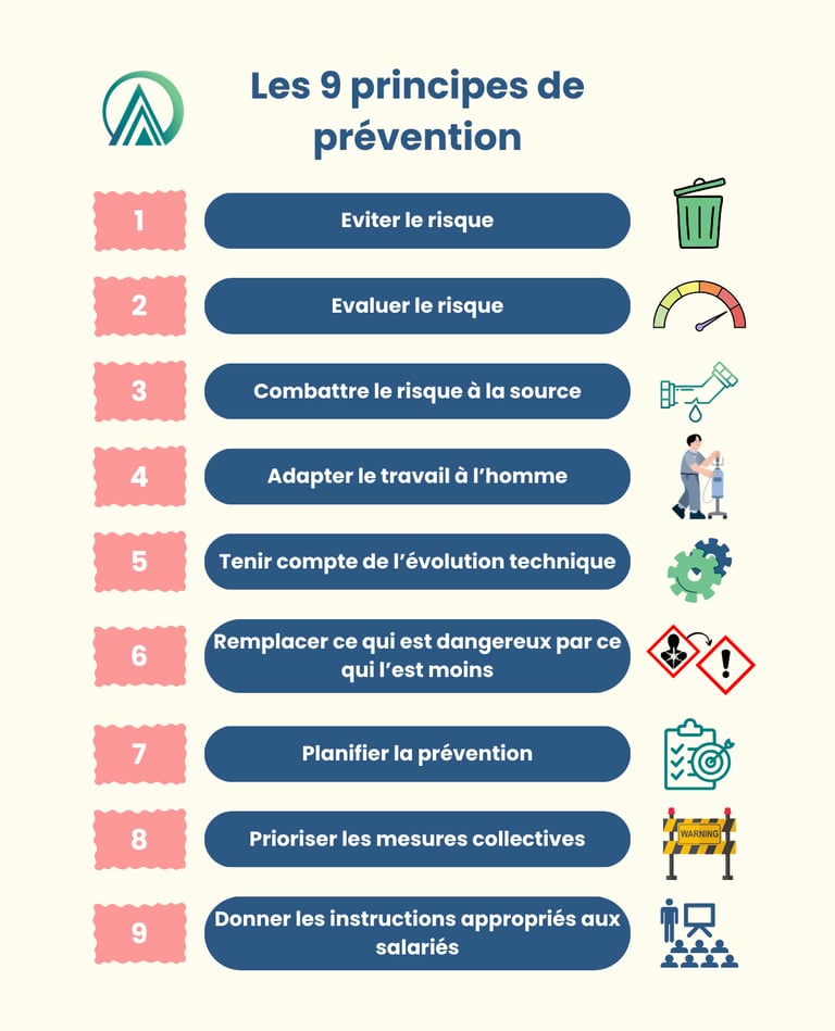Pour cela, il tient compte des principes généraux de la prévention (voir ci-contre). L'objectif est en priorité de supprimer le risque. Si ce n'est pas possible, il faudra le minimiser en l'attaquant à sa source. Il faut adapter les postes aux travailleurs et utiliser des moyens techniques en tenant compte de l'état de l'art.